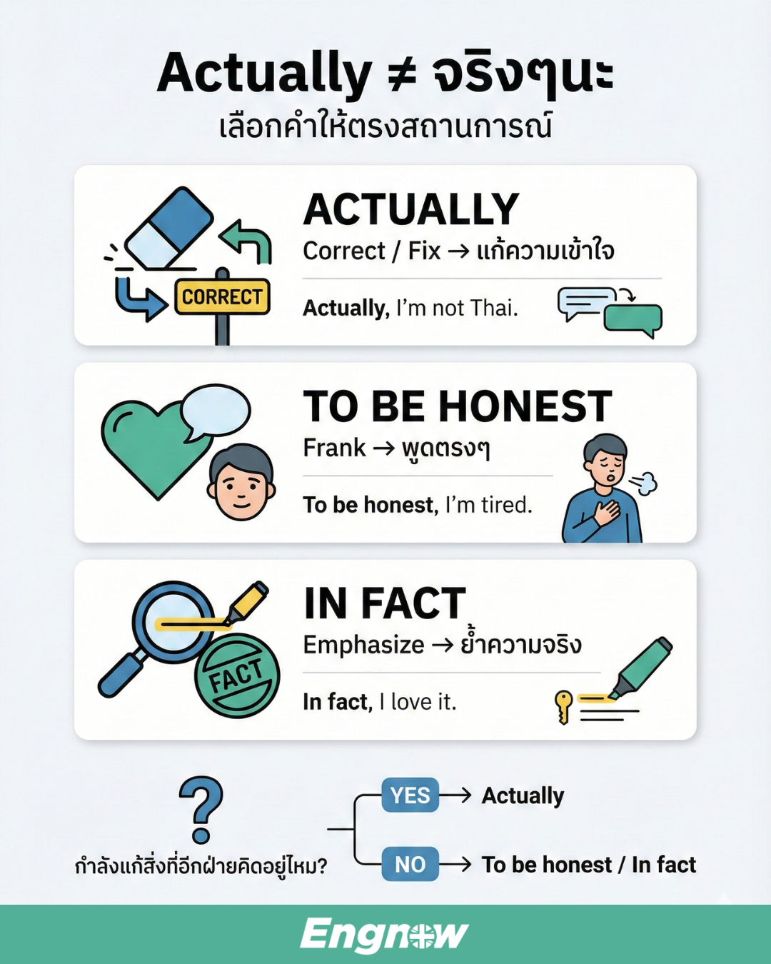 - Actually = แก้ความเข้าใจ / ไม่ใช่อย่างที่คิด