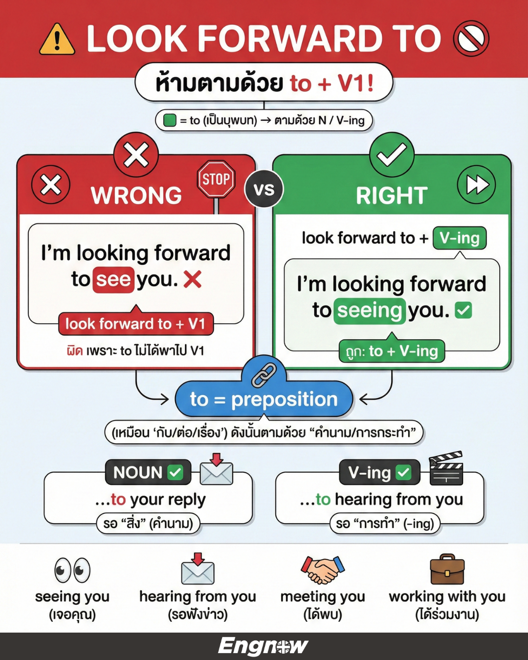 “forward to” = ตามด้วย -ing (เกือบทุกเคสที่เป็นกริยา)