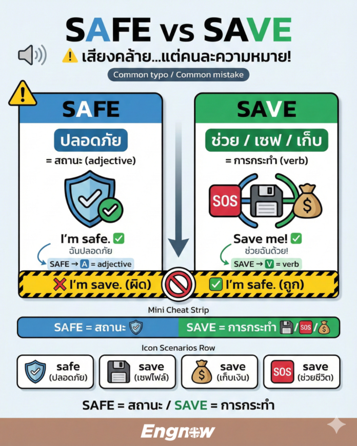 - safe (เซฟ) = “ปลอดภัย” (เป็นคำคุณศัพท์)
