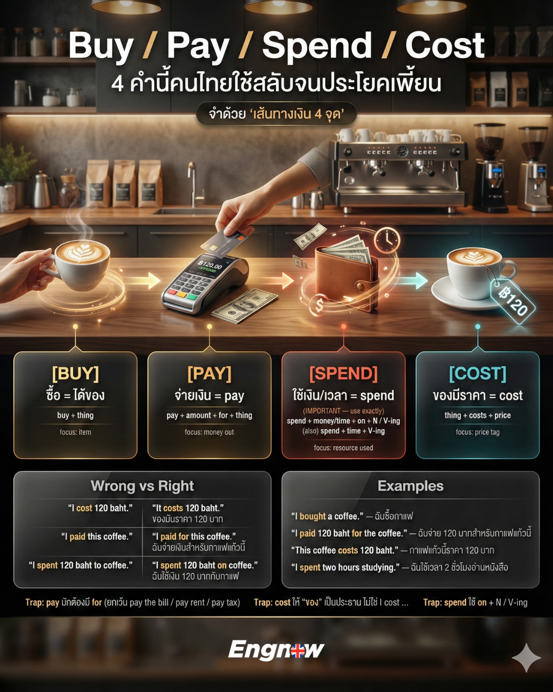 buy = ได้ของ | pay = จ่ายเงิน | spend = ใช้เงิน/เวลา | cost = ของมันราคาเท่าไหร่