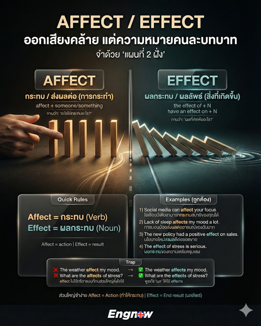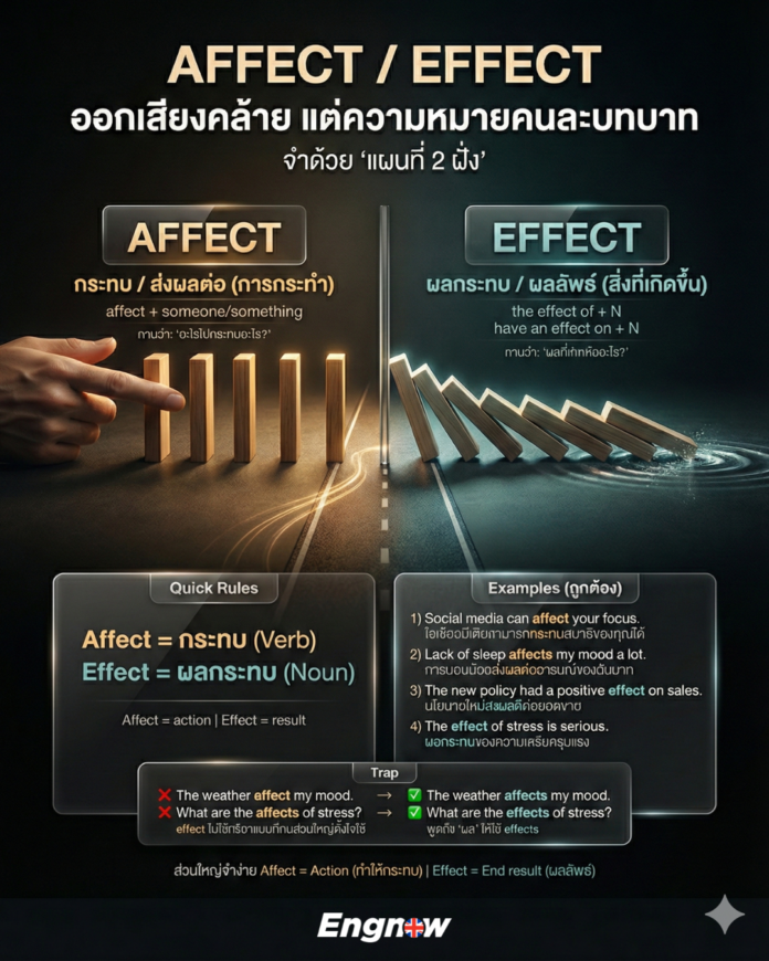 Affect = “กระทบ/มีผลต่อ” (เหมือนกำลังทำอะไรกับบางสิ่ง)