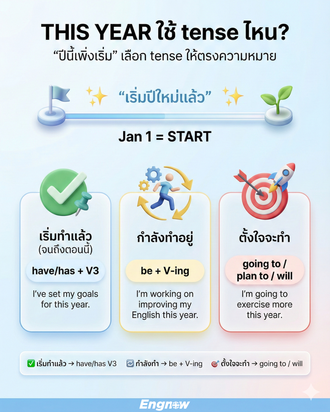 หลายคนพออยากพูดว่า “ปีนี้…” จะเผลอใช้ tense เดิม ๆ จนพูดไม่เนียน